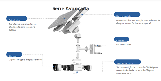 Transmissão: a câmera opera via rede 4G ou Wi-Fi para enviar as imagens em tempo real para a sua central.